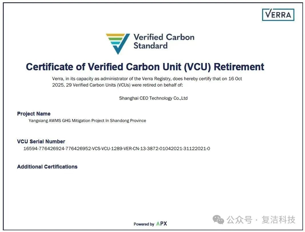 本次团建活动的碳排放总量为28.21吨,包含活动全生命周期碳排放,主要包括交通、住宿、物料食品及活动场地排放等。复洁采用子公司捷碳自主开发的国际碳信用VCU进行中和,注销数量29吨,实现团建活动“零排放”,为地球降温,守护我们共同的家园。