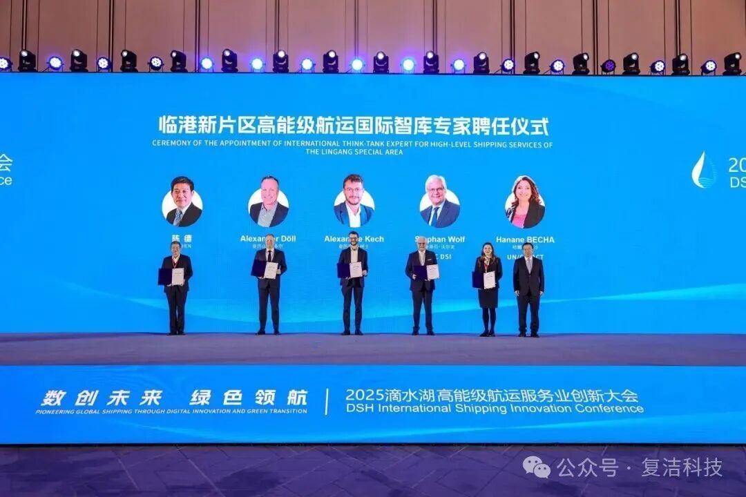 会议现场,复洁科技首席科学家、挪威工程院院士、挪威皇家科学院院士、欧洲科学院院士陈德获聘成为临港新片区国际航运咨询专家智库。