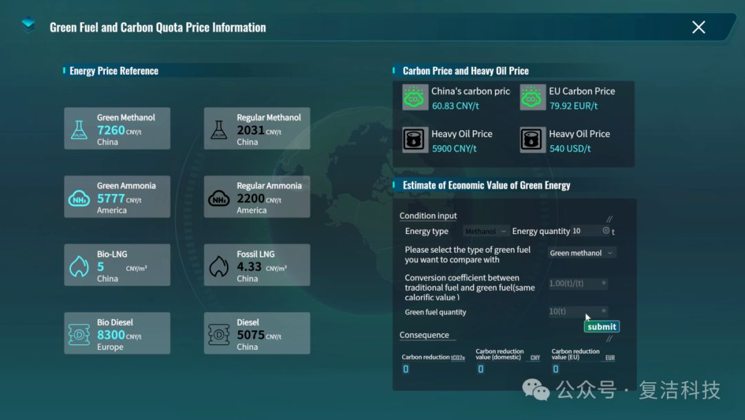 “绿能估值”工具,基于传统能源与绿色能源的最新价格与国际国内碳价走势,帮助船东即时掌握燃料基础价差及叠加碳价后的综合价差,为评估燃料替代运营决策提供决策依据。