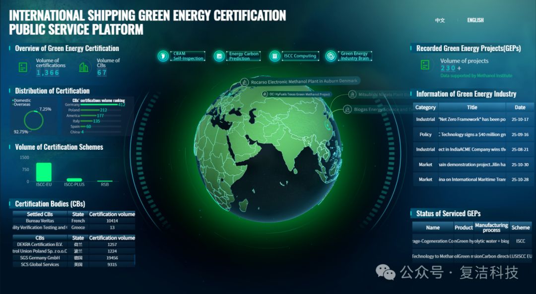 国际航运绿色能源认证公共服务平台,是在上海临港新片区管委会的支持和首席科学家陈德院士的全程指导下,由化学工程与低碳技术全国重点实验室临港基地(华理-复洁绿色能源化工联合实验室)负责开发建设。