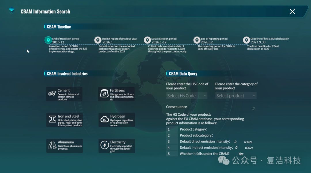 CBAM查询工具,支持货主进行欧盟碳税的合规申报,货主能直观地获取履约时间表以及纳管行业范围,直接调取欧盟认可的产品碳排放因子,为合规报送提供数据支撑。