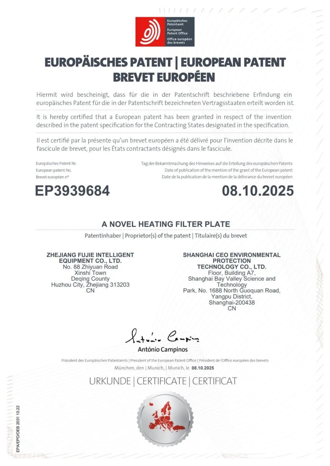坚持自主研发创新赋能,打造高价值知识产权。"Ni-Co-Cu-Fe-In-M高熵金属间化合物催化剂"获中国发明专利授权;“一种新型加热滤板”获欧洲发明专利授权;创新升级产品“分布驱动滤布行走式压滤机”在市政项目落地。