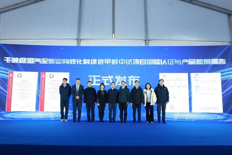会议现场,骆大进、蒋传海、翟金国、叶源新、陈德、黄文俊共同见证此次中试装置产出的首批绿色甲醇产品。项目成员单位代表共同启动项目中试验证,相关部门负责人及全球甲醇行业协会代表共同发布项目国际认证证书和绿色甲醇产品检测报告。